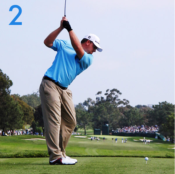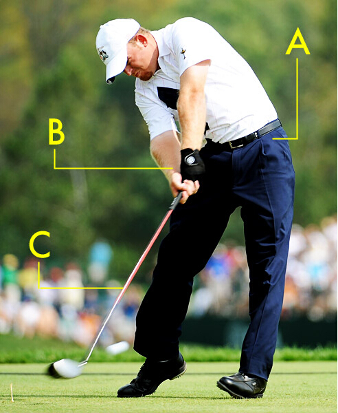 Holmes的落杆蹲腿及手腕姿势弥补了击球准备姿势及上杆顶部的不足。他以几乎完美的45度角进行击球。注意身体转动顺序:双腿、臀部及肩部,最后才是手腕。