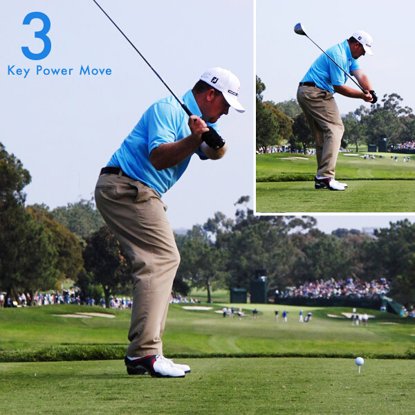瞧他的双脚,几乎离开了地面。这会让你遐想他在挥杆时究竟使出了多少力。Holmes挥杆时杆头速度最高可超过135mph。虽然其他球员也可达到该速度,但他却能打出更远的距离来,比巡回赛上开球最远的选手还要长20码。他的秘诀在于:在击球时杆头向上运动。手臂:伸长手臂以产生最大的杆头速度。球杆:球杆在击球时向上运动,可产生高起发角、低后旋的力量型发球。 臀部:臀部在转身过程迅猛转动。