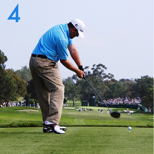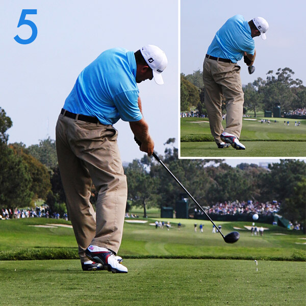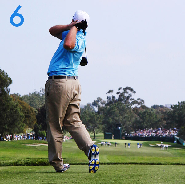 杆头速度带来的离心力使他在收杆时身体转至极限。虽然姿势上并不完美,但却是非常稳固及高效能的挥杆。