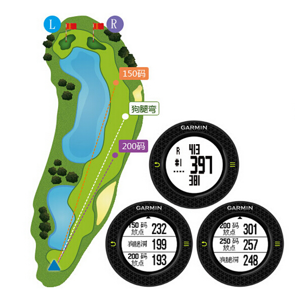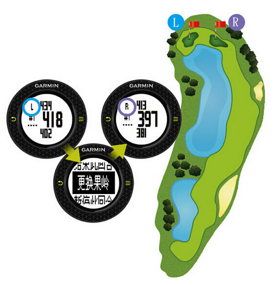 S4拥有全球80国17,000以上的球道信息,能提供参考距离,支持双果岭,即便视野内看不到果岭,也可掌控果岭位置,配合球童经验,辅助您更精准的击打。S4额外提供了不同置球点的参考距离,包括距离洞口100、150、200、250码置球点,及其所对应需要挥杆的距离。其随时切换预览当前球道果岭图,即使在视野上遇到障碍物,也可完全掌控果岭的轮廓与大小。同时,用户可依照当日球洞位置手动设定旗杆位置,手表所显示的距离也会同时自动改变。