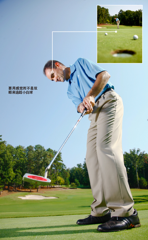 下面介绍一种有效的训练法:拿3个球去练习果岭,练习长推。击球后使头部保持不动,猜测一下球的滚动情况,打短、打过、偏左还是偏右了。过几秒之后再抬头看球,看看你的猜测是否符合事实。如果你的猜测不准确,就在下次推击时调整击球动作。不断击球,直到你的猜测变得准确为止。经常采用这种训练法,你对击球的感觉会大为改善。到那时,速度和方向控制将成为你的第二本能。