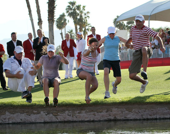 年度第一场女子大满贯赛有一个传统,选手取胜之后会跳入波派池塘(Poppie’s Pond)庆祝。而当她从池塘中起来的时候,主办方会送上一件雪白的浴袍。