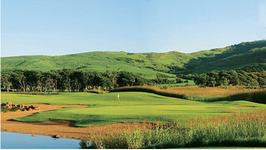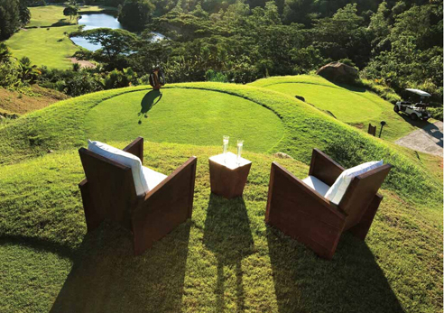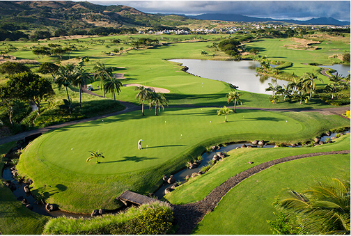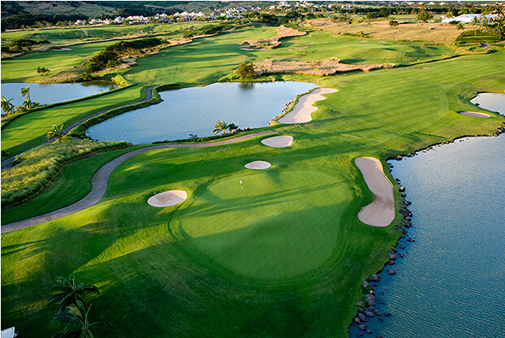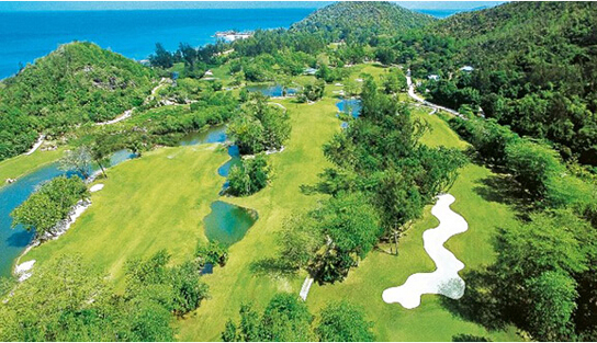在这里,从1-5号、7-9号,以及17-18号球洞处可以看到印度洋在阳光下闪烁着微光的美景,这些球洞从海面一直延伸到岛屿南部的贝尔欧布莱的山麓。而美丽的湖水在7、9、11、13和18号球洞处等待着高尔夫球手。