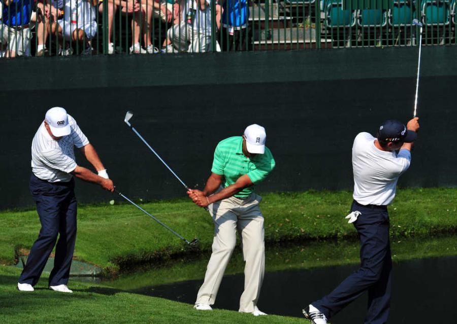 从左至右分别为老虎-伍兹、吉姆-福瑞克以及弗雷德-卡波斯,他们于16洞水塘前打“跳水球”的情形。