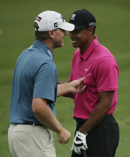 伍兹和史翠克一直都是很好的朋友,莫非这是他们标志性的问候方式么?或者只是保留与特殊场合的问候?(来源:新浪体育)