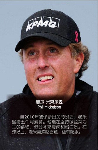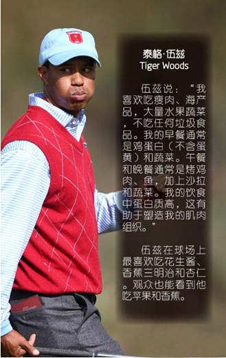 伍兹谈起自己的饮食习惯时,这么说:“我一直保持健康的饮食,吃大量的水果、蔬菜、坚果、鱼和鸡肉。我也意识到水分的重要性,以及它如何让我专注于打球。”