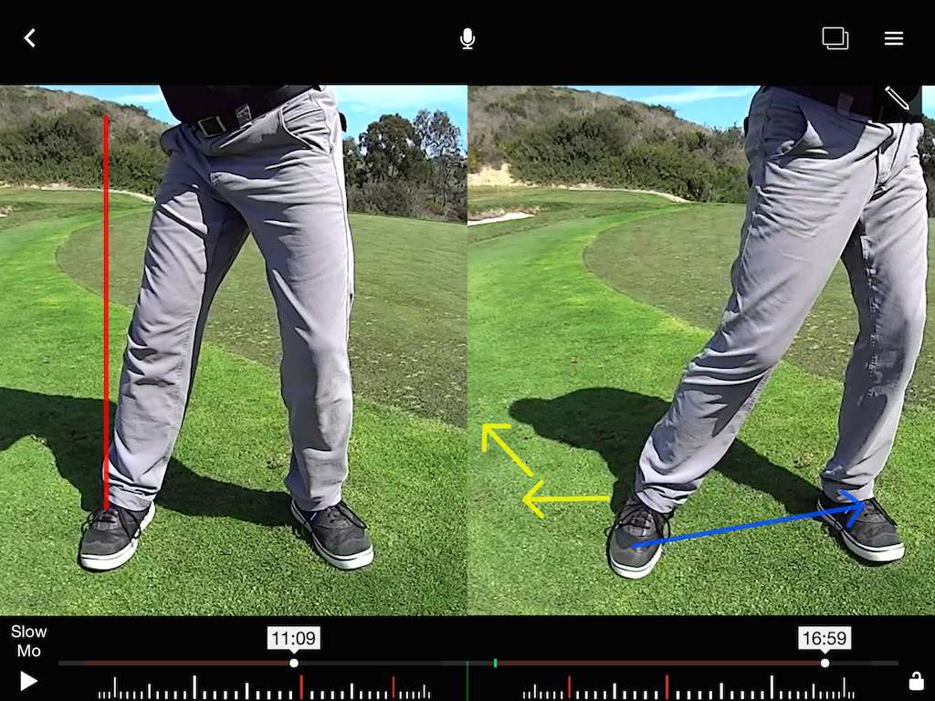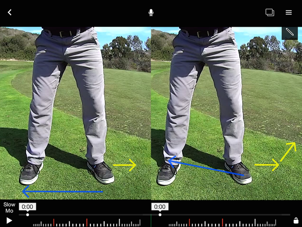 照片中的黄线代表左脚施力的方向,并产生侧向运动(蓝线表示)。右图中添加的斜向黄箭头表示需要将身体重心移至右脚根所施加的逆时针的力。