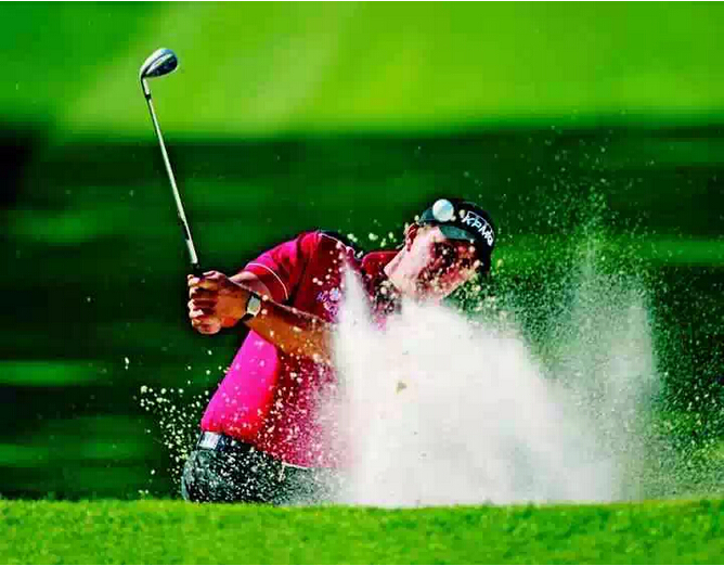 (5)加速通过沙子。要挥杆穿过球,而不是到球即停。在送杆过程中,两只手臂都要伸直,球杆指向目标。