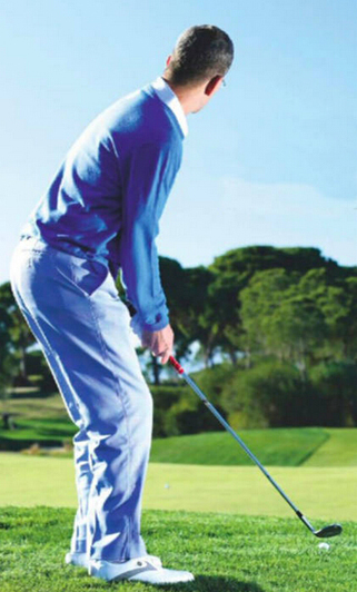 当球落入果岭边厚厚的长草中时,球位往往非常糟糕。这时要选择较宽的站位,并且让杆身后倾,杆面对准目标方向。