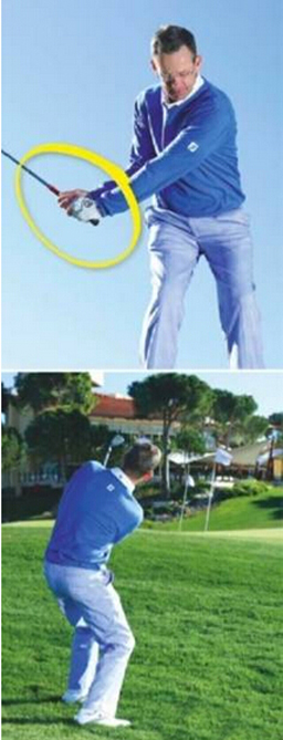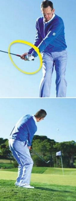 起杆的时候应该快速立腕让自己的上杆轨迹更加陡峭。当你下杆释放手腕的时候,应该保持自己的右手始终在杆身的下面。这样可以让你保持杆面倾角并且将球送得较高以便更快停球。