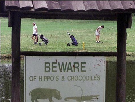 当你听到球场上有人谈到“15英尺”的时候,很有可能他们不是在谈一个15英尺的长推。球场横穿南非克鲁格国家公园,巨大的鳄鱼也是该球场的天险之一。当你走进树林的时候,可能会发现羚羊的尸体从树上垂下来,这是美洲豹的作品。果岭旁边的水塘里,河马们在打着呵欠。