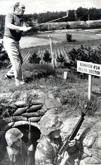 在这里打的久了,你的球可能会引发几场爆炸。只要运气不太差,在韩国的美军基地里,这是不太可能发生的事情。这里没有高尔夫球场,只有一个192码的 Par3洞。果岭旁的一张通告写的很清楚:“危险!不要去野草雷区捡球。”据《华盛顿邮报》报道,至少有一次开球触发了雷区地雷爆炸。