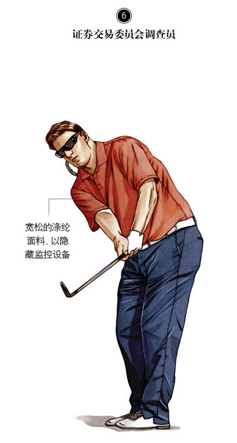 标志: 海军蓝或带褶的卡其裤,长袜,新买的老式廉价球鞋。穿不带logo的宽松polo衫,用以掩盖监视用的无线电和对讲机设备。下场前临时从店里买的未经熨烫的平檐帽。宽边框Oakley太阳镜。租来的球杆。
