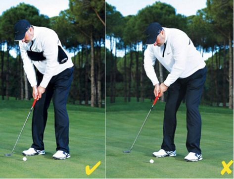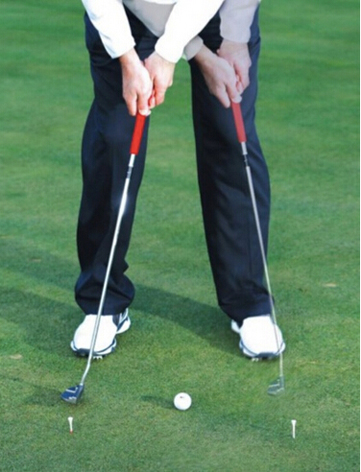 当面对长距离推球时,很多球员的上杆和送杆动作不均衡,这直接导致对推球距离的控制不足。因此保证在推杆过程中相同的上杆和送杆距离至关重要,这可以帮助你理解在面对不同的推杆距离时所需要的上杆幅度。在训练过程中,在球的前面和后面的相同距离分别放置一个球座。注意用球座检测球在上杆和前送过程中是否达到相同的距离,并体会这种控制感。你会发现球的滚动距离更具有一致性。