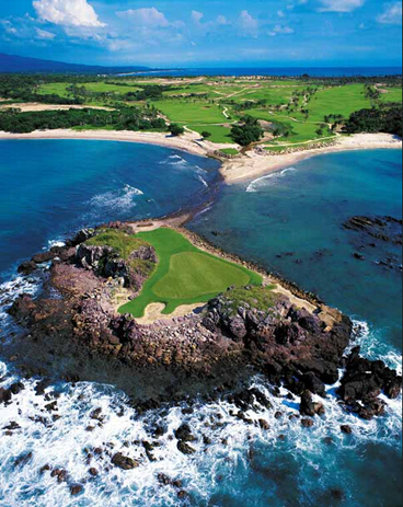 从正式比赛用发球台越过太平洋海域,直至黑色火山石小岛上,总长199码。只有在落潮时驾驶水路两栖交通工具才能登上这个小岛。