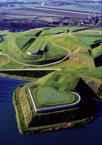 敦刻尔克是法国北部历史悠久的古镇,镇上水源充沛,石头墙是其特色。想象力十足的法国球场设计师罗伯特·波奈特梦想建一座堡垒来俯瞰镇上的高尔夫球场。事实证明,他果真做到了。第4洞岛屿果岭被一座心形的城墙围绕,是爱是恨,还得看你的球是否落水。
