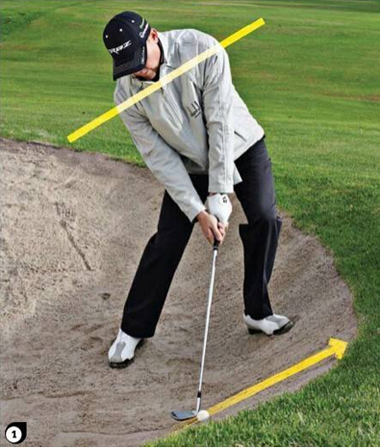 如果你的肩膀过于倾斜,而身体重心过多地放在右侧,打起来就麻烦了。起杆时有太多的重心放在右侧,你就不能将力量很好地转移到球上。而击球时重心都在右脚上,就意味着你要么会打起很多沙子而不是打到球,要么打不打沙子,而球杆会将球直直地向上方打出,球可能会径直飞到果岭的另一头。