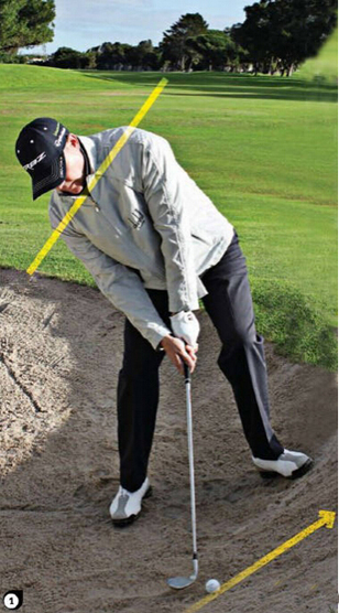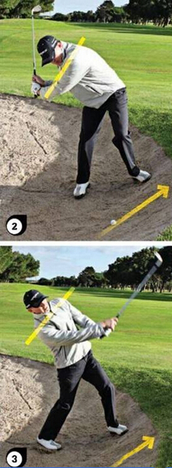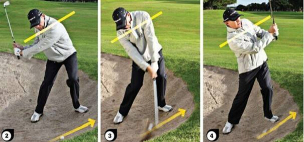 记住你不必太注意去打开杆面,因为斜坡的角度自然就会给你形成一个弹道。你还需要保证左髋比右髋高,这个姿势有助于在斜坡上正确地转体,也会帮助在挥杆时保持正确的轨迹。