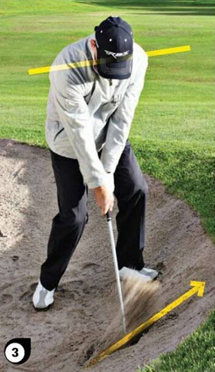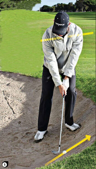 不管是在球道上、沙坑里还是长草中,让双肩与斜坡平行很重要。处在沙坑里比较陡的上坡时,你的第一个动作就应该是调整肩部与斜坡平行。这样,就会帮助你更好地将重心转移到右侧,当然,一部分重心保留在左侧也是很重要的,因为这会保证你在起杆时不会向后倒。