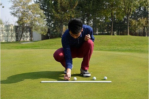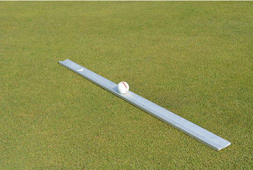 2.(上图)在选择区域的边缘插入一个球座或一支铅笔,以此作为一个起始点。持住斯蒂姆果岭测速仪的一端,将果岭测速仪紧靠起始点,将球放在果岭测速仪凹槽上,果岭测速仪底端固定不动,瞄准球要滚动的方向,慢慢抬起果岭测速仪上端,直至球从凹槽开始滚动。用Mark标记好球滚动后停止的位置。用测量尺测量出始点至球滚动停止点的距离,并做好记录。