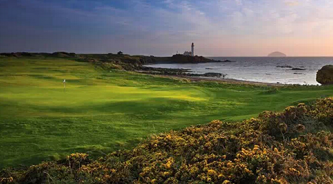 坦伯利艾利萨球场9号洞449码标准杆4杆,是球场最具特色的一洞。站在开球台上,左侧是浩瀚的大海,对面是海水冲刷的岩石,远处是高耸的白色灯塔。第一杆开球需要跨越200码左右的峡谷,才能落到对面的球道上。
