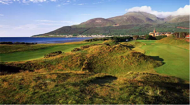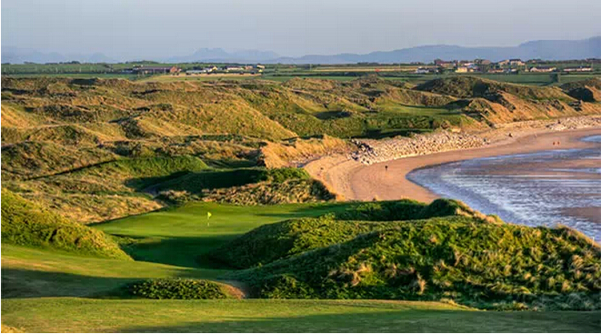 这儿拥有最美丽的海岸线纽卡斯尔,球场就沿着海岸线建立,远处是悼念山,左侧是爱尔兰海。第九号洞四杆洞(428码),开球看不到落球点,需要瞄着左边的沙丘打。沙坑将会吞噬任何莽撞的进攻,果岭边有两个50码长的沙坑。