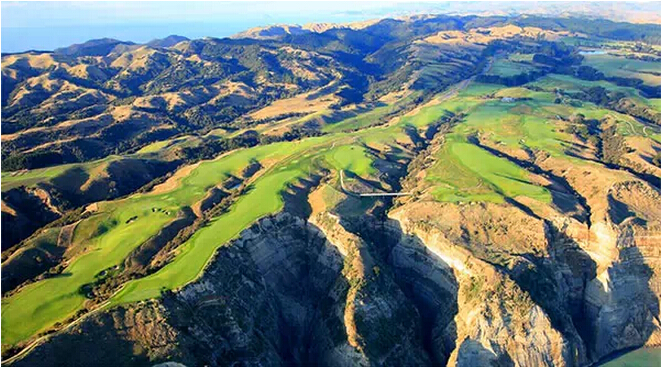 新西兰绑匪角球场开业于2004年,是美国设计师Tom Doak设计,球场随处可见悬崖峭壁。第15号洞,从发球台到球道到果岭,宽度逐渐缩小,果岭仅有20米左右。