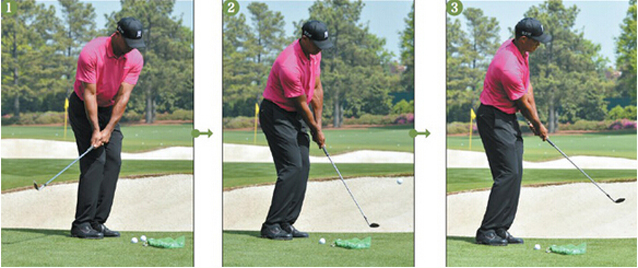 对于短距离的切击,伍兹双脚并拢,双膝微曲,保持脊柱固定,仅是通过转肩来击球。他在挥杆过程中始终保持左手引领杆头,手腕几乎没有释放。