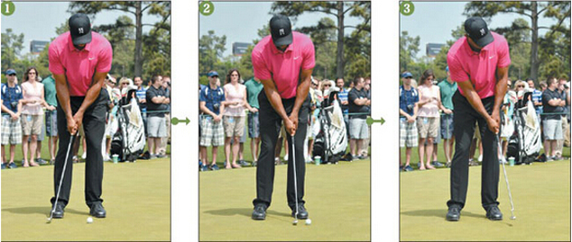 图中所示,伍兹正在进行约5码距离的推击练习。伍兹所做的一切都是为了保持推击姿势的稳定和可重复性。