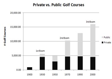 美国公开赛上本土球员的奇迹就像催化剂,美国高尔夫市场的潜力正逐渐被挖掘。在1923年至1929年,平均每年有约600家高尔夫设施开业(出自 Adams等人,1985年)。而这种增幅在1930年的时候达到顶峰,当时全美大约有5600家高尔夫设施以及110~150万的高尔夫人口。根据球场与打球人口的比,我们发现,直至此时,高尔夫在美国仍以私人球会的形式在运营。即使在美国,高尔夫也是从富人圈子里流传开的一项精英运动。对于一般的体育运动来说,高尔夫是特殊的,它被上层人士以“私人球会”的形式设置了进入壁垒。