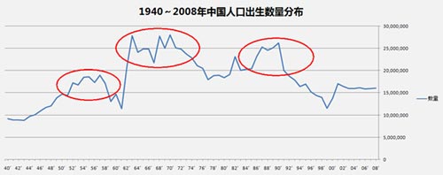 当然婴儿潮并不只出现在美国,同样也发生在中国。自1949年新中国成立后,也经过了三次婴儿潮。分别是“1952~1958”(因为人口基数小,因此绝对数量不大)、“1962~1973”以及“1986~1990”(见下图红圈部分)。截至今年,这三个群体的年龄分别在“55~61”、“40~51”和“23~27”岁。