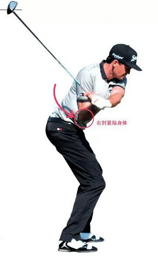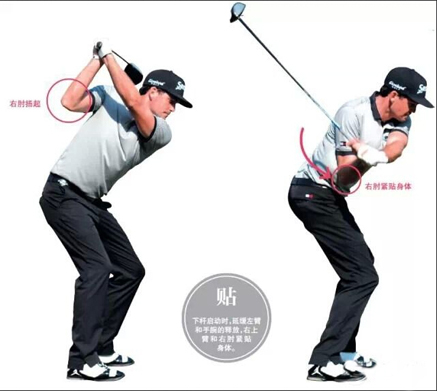 贴:下杆启动时,延缓左臂和手腕的释放,右上臂和右肘紧贴身体。