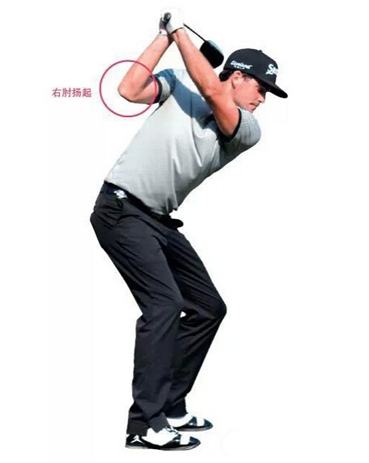 请注意他的右臂位置,在上杆至顶点时扬起的右肘已经紧贴上半身。相比之下,他的左臂和双腕都没有释放,只是在控制下杆平面。更具体点,他右肘贴近的位置并不是身体的右侧方,而是更靠近身体前侧。这样做的目的是让双臂与身体保持紧密联系,实现更有效的力量传递,也能够规避我们常见的双臂挥杆滞后或者是下杆受阻的现象。