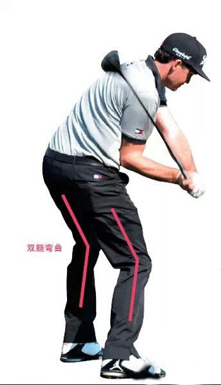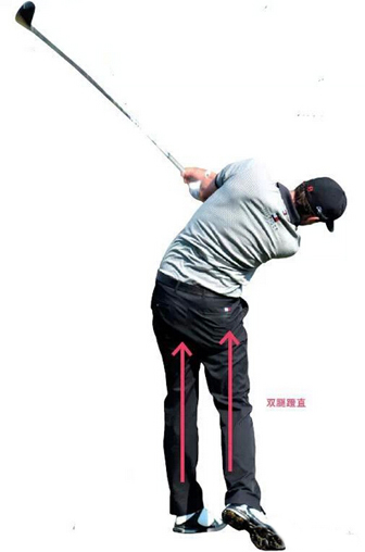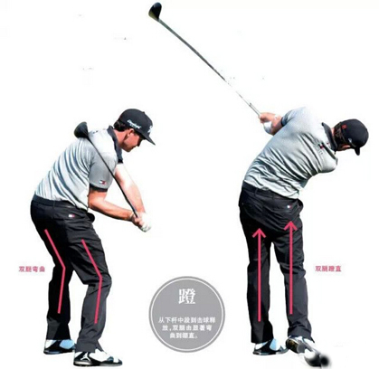 蹬:从下杆中段到击球释放,双腿由显著弯曲到绷直。