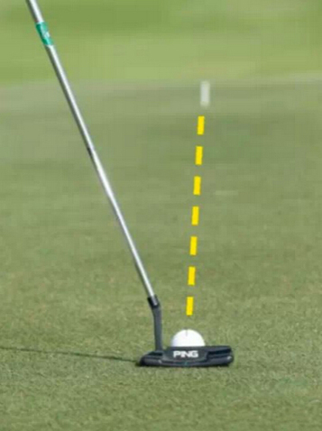 然后,当你下场之前,在自己的球上画一条线。在果岭上摆球时,注意将这条线瞄向拐折的起点。当你准备推球的时候,这可以起到一个很好的参照作用,你可以根据这条线放置你的杆面并调整身体的方向,从而把洞杯转移出你的注意力当中。