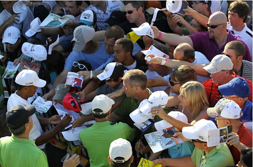 与其它体育项目不同的是,高尔夫选手会与观众近距离接触。因此,任何观众都有机会当着球星的面说话。由于机会来的短暂,有的球迷在说话时可能太激动,以至于口不择言,出言不逊。如果是面对老虎伍兹的话,则会紧张10倍。