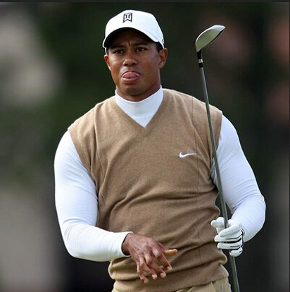 Tiger Woods 专用的双色搭配方法:驼色的nike运动衣,套一件紧身的长袖白色圆领子衬衫