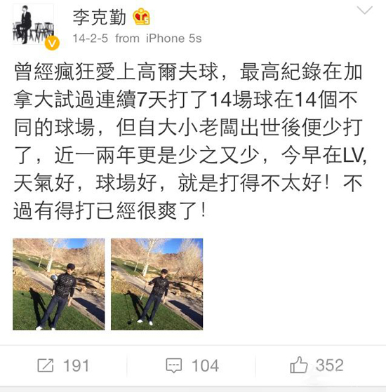 2014年2月5日,李克勤在微博上写道:“曾经疯狂爱上高尔夫球,最高纪录在加拿大试过连续7天打了14场球在14个不同的球场,但自大小老板出世后便少打了,近一两年更是少之又少,今早在LV, 天气好,球场好,就是打得不太好!不过有得打已经很爽了! ”