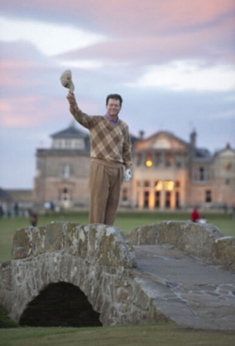 汤姆-沃森在苏格兰圣-安德鲁斯老球场的那个星期五在斯威肯桥上向球迷挥手告别。(拍摄时间:2010年7月16日)