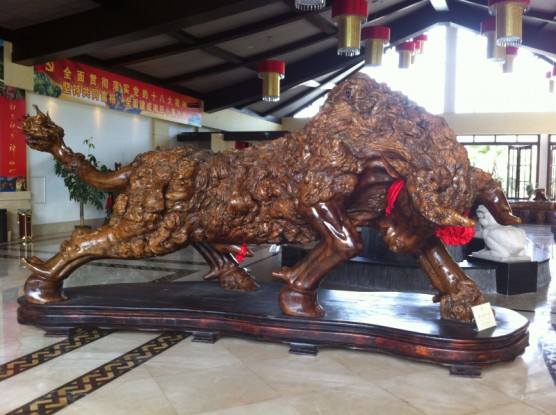 来三亚神泉打球,最先吸引你的可能是不是36洞球场的某个洞,而是它的神牛会所。灰黑色的长角屋顶、泥黄的土坯墙身,整个建筑置身于一片郁郁葱葱的绿野之中,给人强烈的视角反差。远远望去,犹如一只刚拉完耕犁完田的牛趴在绿荫树下安静地歇息。牛在海南人的心中有着重要的位置,它不但是当地人崇拜的图腾对象之一,更象征着生活在这片土地上的人勤恳、踏实的特点。在古代神话传说里,牛是带有宗教色彩的动物,它与许多民族的文化相联相承,或许是这个原因,这个会所被命名为神牛会所。除了建筑外形酷似向上弯曲的牛角外,会所名字中的“牛”也并非虚有其表。进入大堂,一只头戴红筹的神牛木雕正面朝着大门俯首耸肩,犹如蓄势待发。站在它的面前,巨大的身体,大有扛鼎拔山的气概,心底不由自主地就会产生一种震撼和惊叹。这只富有表情的神牛木雕,或取自然造型,或雕琢成形,无不巧夺天工。