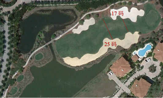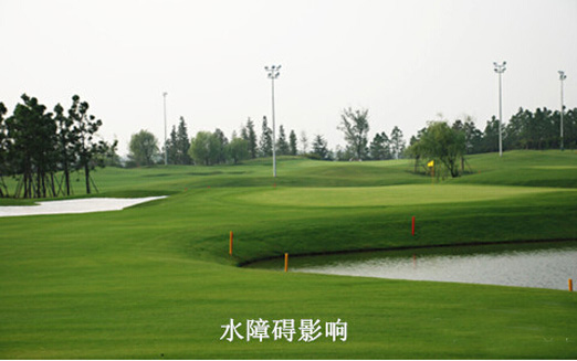 考虑水障碍对打球的影响是根据到达落球区(球道或果岭)所需的击球距离;安全越过水障碍的击球距离以及水障碍到落球区(球道或果岭)中心的距离。同时还要考虑在每一个落球区的下坡坡度,它可能会增加水障碍对打球的影响,以及果岭周围被水障碍环绕的比例。