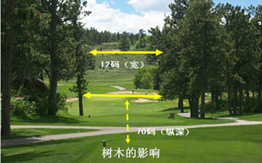 树木障碍影响是根据树木的大小和密度;每个落球区中心到树木延伸的树枝或到根部在视线水平位置或以下的距离;再击球的难度以及击球距离。树木的悬垂也会使球道的有效宽度缩短。