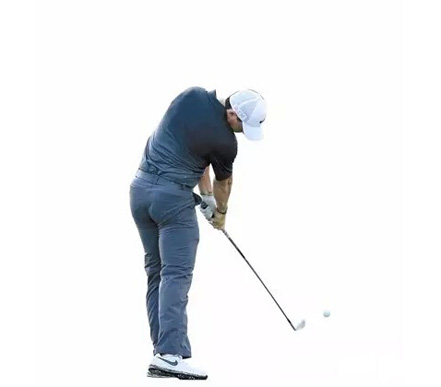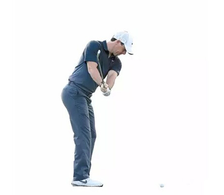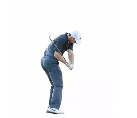 下半身急速转动,左臂和球杆之间的角度保持不变。右肘下降,贴近身体,髋部打开,保持头部位置,双臂即将释放。