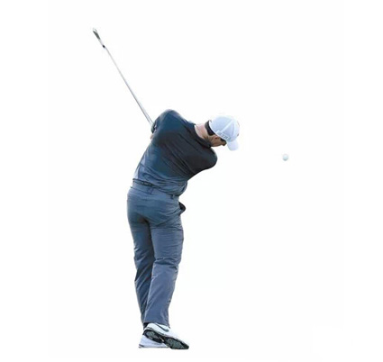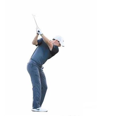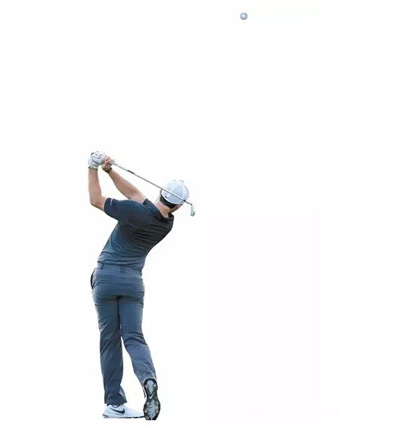 完美的收杆姿势,展现出美妙的平衡和节奏。在迅猛的挥杆动作后,小麦都能举重若轻地保持收杆姿势,直至目送球落地。右脚竖直点地,右脚跟没有外翻。