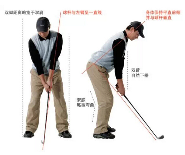 左脚掌开22度,右脚开10度。左右脚尖连线与球飞行线路OPEN。背自中段开始自然弓突.躯干--胯部的夹角及大腿--小腿的夹角应利于身体的协调发力。