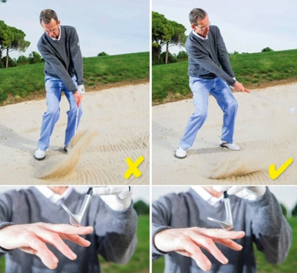 如果你做到了这里提到了每一个环节,那么最后你需要注意的是球杆进入沙坑时所产生的独特声音。这应该是一种“噗”声,而不是“砰”的声音。当球杆进入沙坑的角度恰到好处时,球杆进沙较浅,所带出的沙量不多。如果带出沙量很多的话,那就应该检查自己的站位姿势,确保球位在前,并且杆面角度和站位都没有过于开放。