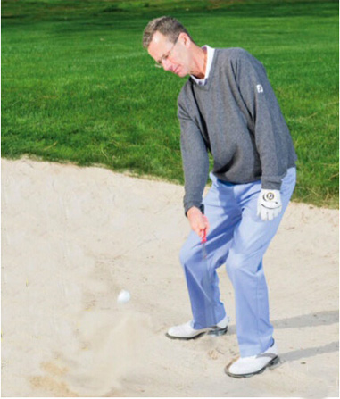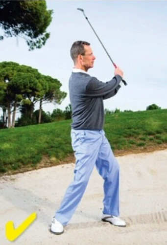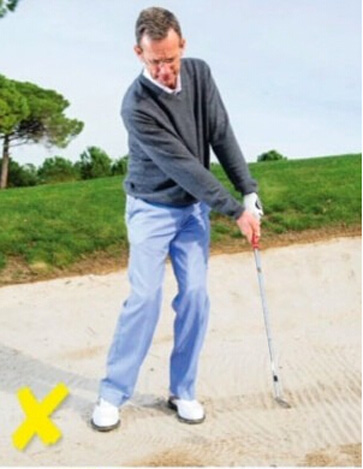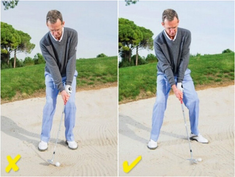 很多业余球员在处理沙坑球的时候采用的是P杆的站位:站位较窄,并且杆身前倾。其实在沙坑中正确的做法应该是让双腿站得更宽,膝盖更加弯曲,并使杆身后倾以增加杆面倾角和反弹角的大小,球位靠前,并保持双手在球的后方。不要采取完全开放式的站位,这会让你的球杆入沙过深。采取略微开放的站姿,这样可以保证球杆在击球时有一个很好的入沙角度。