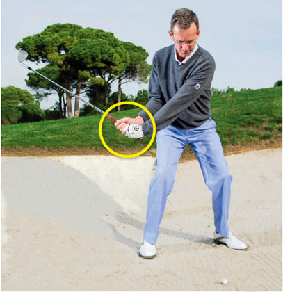 在处理果岭边的沙坑球时,你不能过早地打开自己的手腕。当你在上杆的时候尽量锁住自己的手腕,这样手腕和球杆形成的角度可以在下杆的时候得到充分释放。这样可以让反弹角在沙坑中得到充分的运用并产生作用。当你送杆的时候,杆头会比球更早地从沙坑中出来。