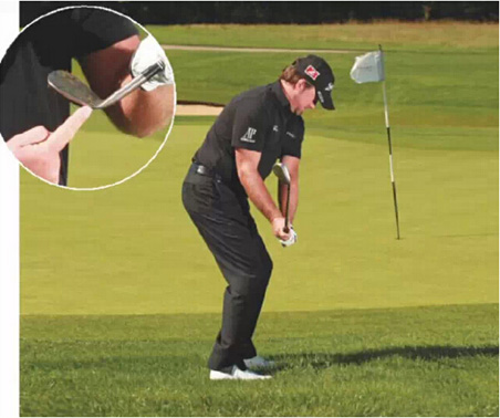 在切滚球时不需要很多的手腕动作。我倾向于把球杆放直立,实行这个技巧时更像是推球而不是切球。与推球时的动作相似,这一击球动作需要肩部的转动。有的人喜欢在这时用推杆,我有时候也会,但这并不是必要的,因为切滚球的一个关键就是不需要用太多的手腕运动。当然,球杆的选择也是很重要的。