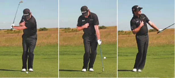 要把这个动作做好,可以时常用一只手练习(如图)。手臂要与身体一起转动,同时保证击球杆面角。多练习,就会找到很好的挥杆节奏。